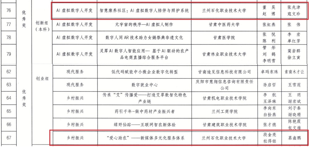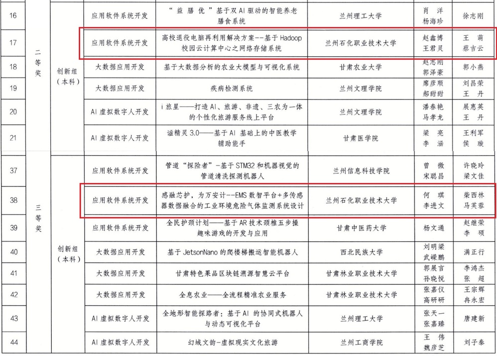 在本届大赛中我校共有5支参赛团队晋级决赛,且与本科院校学子同台竞技,参赛团队表现突出,最终在本科创新组赛道中4支团队获奖,在职业本科院校参赛团队中成绩最佳。其中《高校退役电脑再利用解决方案—基于Hadoop校园云计算中心之网络存储系统》项目在本科组大数据应用开发组排名第三,获二等奖;《感融芯护,为万安计—EMS数智平台+多传感器数据融合的工业环境危险气体监测系统设计》在本科组应用软件系统开发组中排名第五,获三等奖;《“爱心助农”—新媒体多元化服务体系》在创业组乡村振兴赛道中排名第七,获优秀奖;《智慧康养社区:AI虚拟数字人陪伴与照护系统》在本科组AI虚拟数字人开发中排名第十,获优秀奖。我校学子在比赛中不仅展示了较强的技术实力,还展现出了顽强的毅力和坚定的信念,同学们的优秀表现为甘肃省的创新创业工作注入了新的活力。